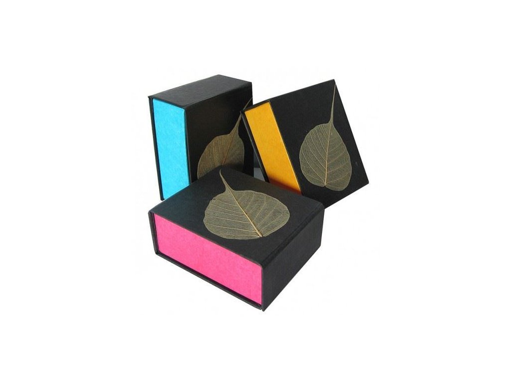 - ručně vyráběná fair trade dárková papírová krabička zdobená listem fíkovníku posvátného, s klopovým víkem s magnetem, velikost 9,5x8x4 cm; výběr barev: černo - žlutá, černo - tmavě růžová, černo - světle modrá. Vyrobeno podle fair trade pravidel v Nepálu.