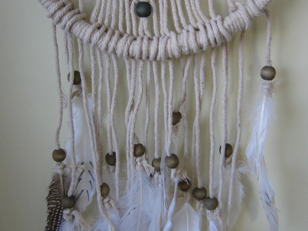 Krásná dekorace do interiéru i čarovný pomocník pro krásné sny. Ruční práce. Vyrobeno z textilií, ratanu, korálků a peří. Každý kus je originál.