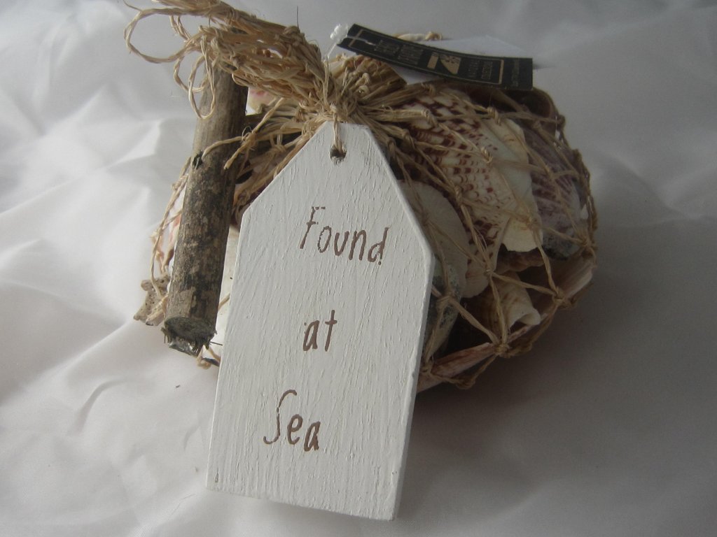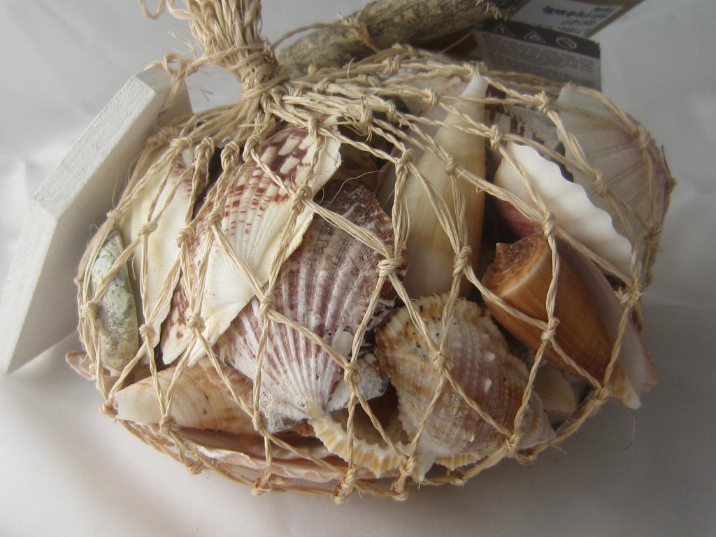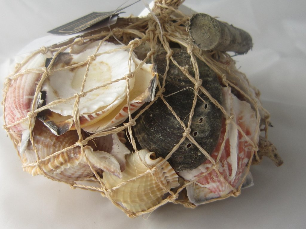 Výběr krásných přírodních mušlí zabalený jako dárek v sisalové síťce s ručně vyráběnými doplňky