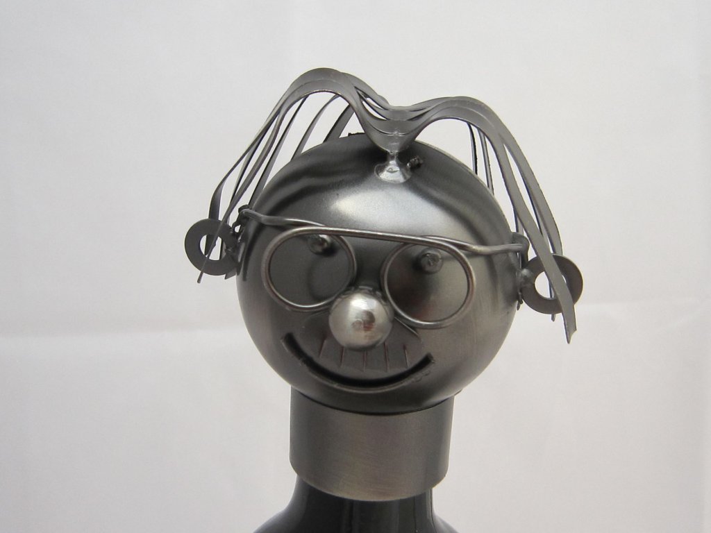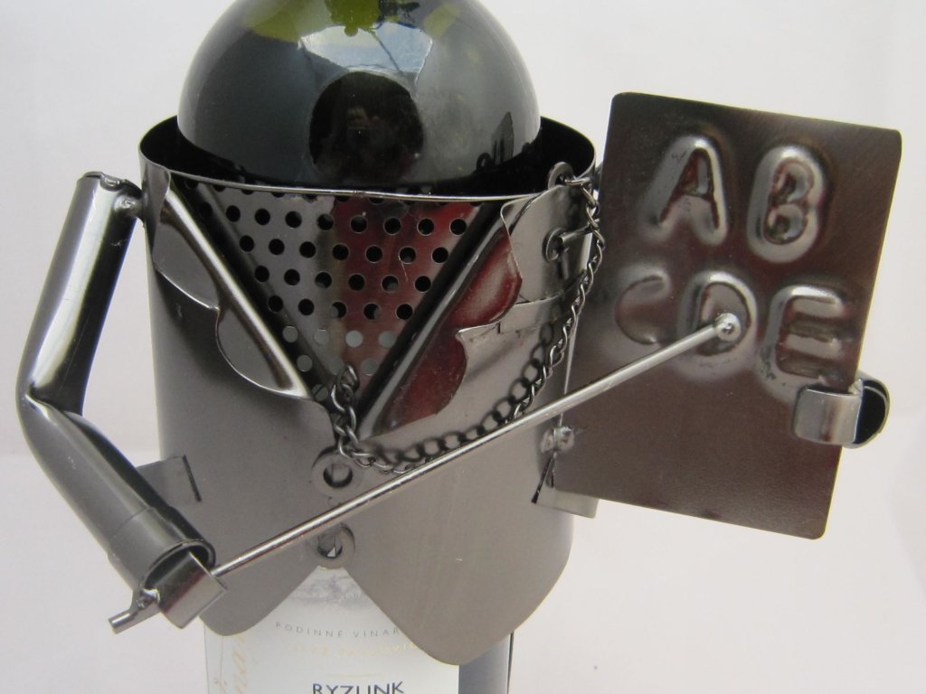 Stojan na láhev v podobě učitele, vhodné jako originální dárek. Hlava drží na hrdle láhve. Ruční výroba, každý kus je originál.