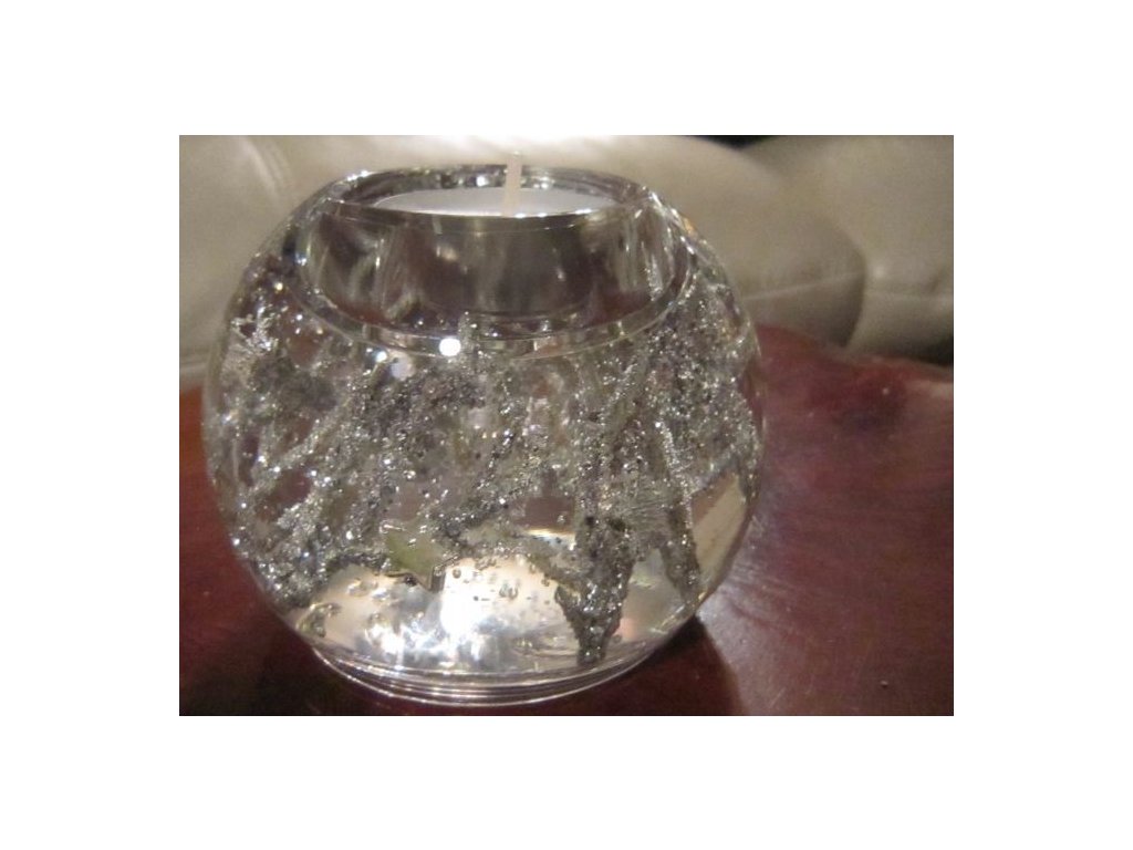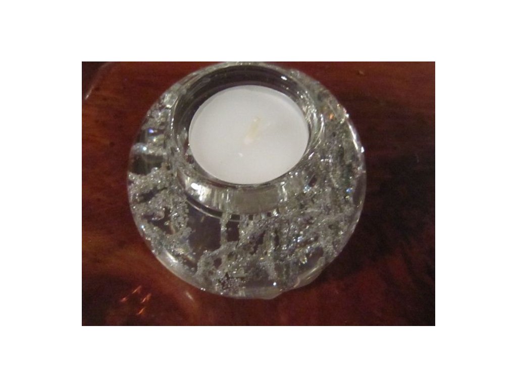 Ručně zpracovaný skleněný svícen se zimní tématikou.
