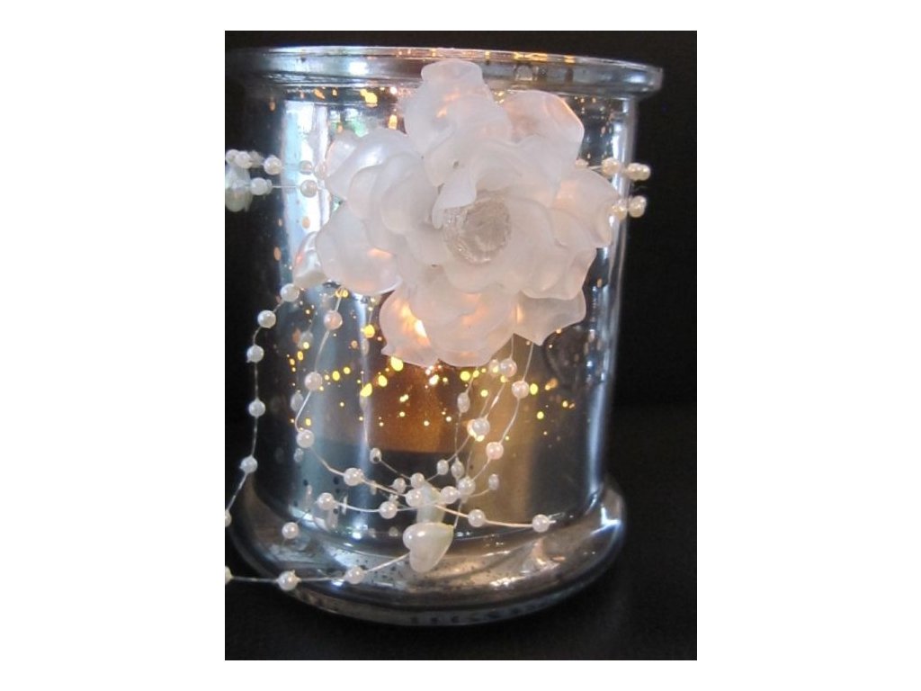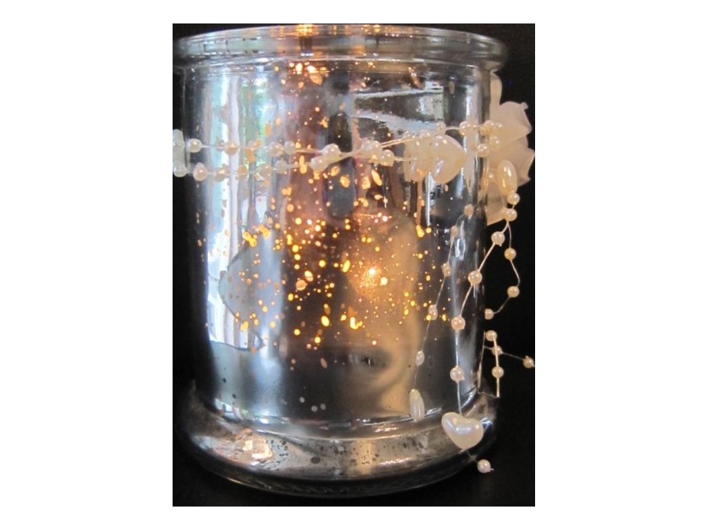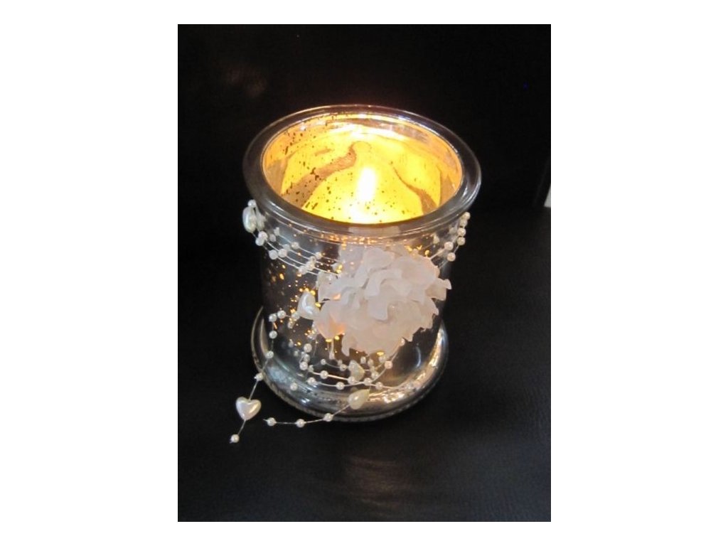 Velice efektní svatební svícen ze skla. Při výrobě byla použita stříbřenka, která vytváří nepravidelný povlak na skle a vzniklými malými otvůrky probleskuje světlo svíčky. Květinová dekorace je vyrobena z recyklovatelného plastu, dá se lehce odebrat a svícen je možné pro jeho nevšední efekt použít i k jiným příležitostem.