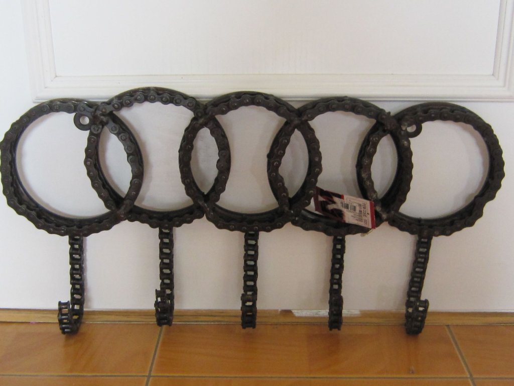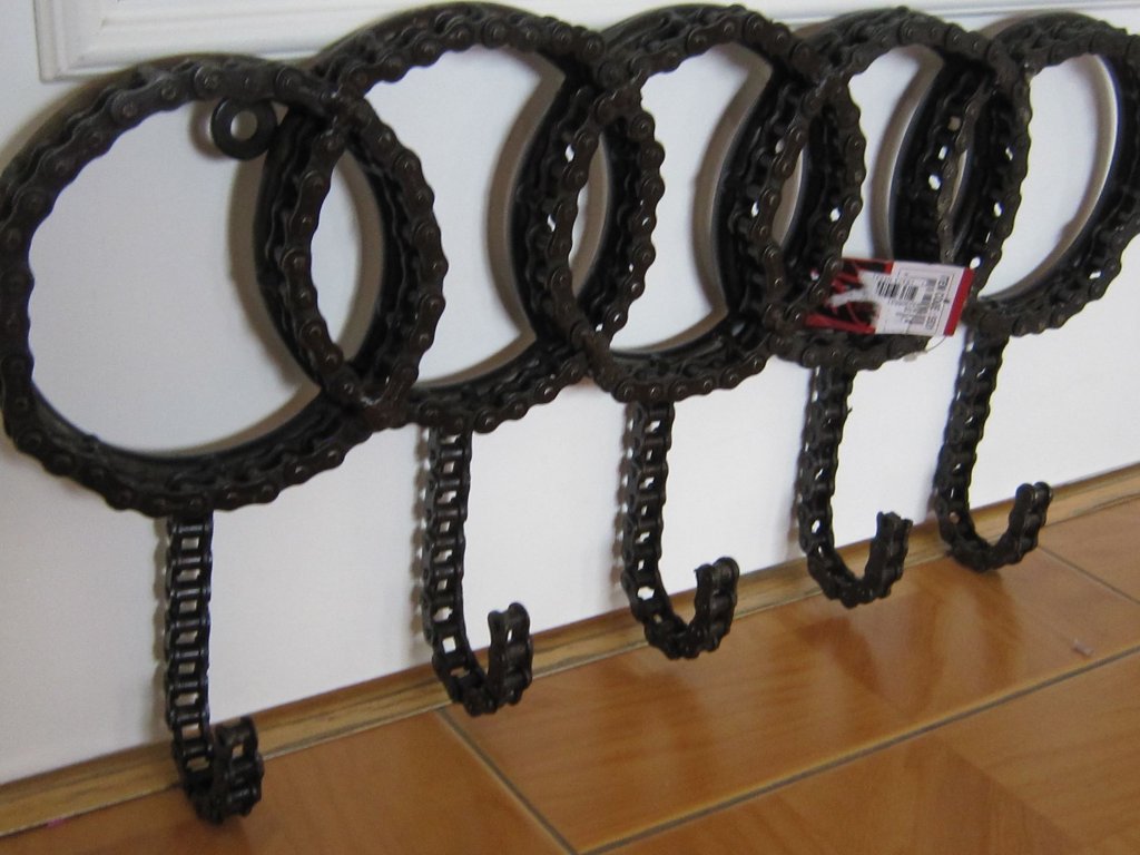 Originální věšák s ekologickým dopadem - Holanďani využili řetězů z nefukčních bicyklů a vytvořili pomocí železné konstrukce "prďácký" věšák na cokoli. Je poměrně těžký, takže se uchycuje na dvou místech - úchyt v železné konstrukci připraven.